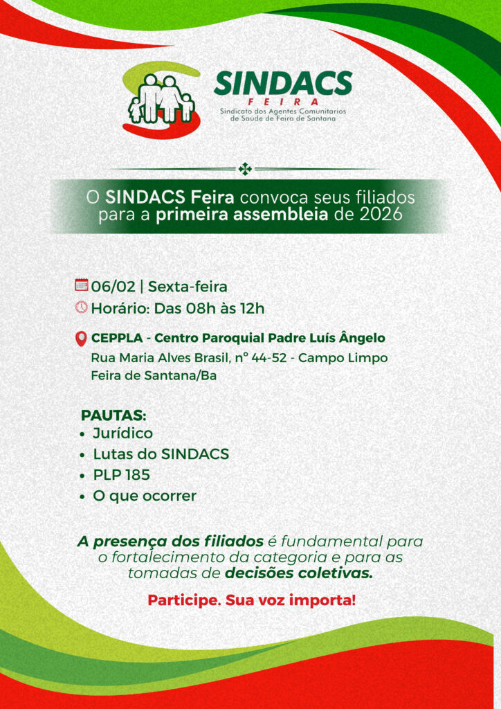 O SINDACS – Sindicato dos Agentes Comunitários de Saúde de Feira de Santana, no uso de suas atribuições legais e estatutárias, convoca todos(as) os(as) Agentes Comunitários de Saúde da base territorial de Feira de Santana/BA para participarem da Primeira Assembleia Geral da Categoria do ano de 2026, a ser realizada conforme informações abaixo: